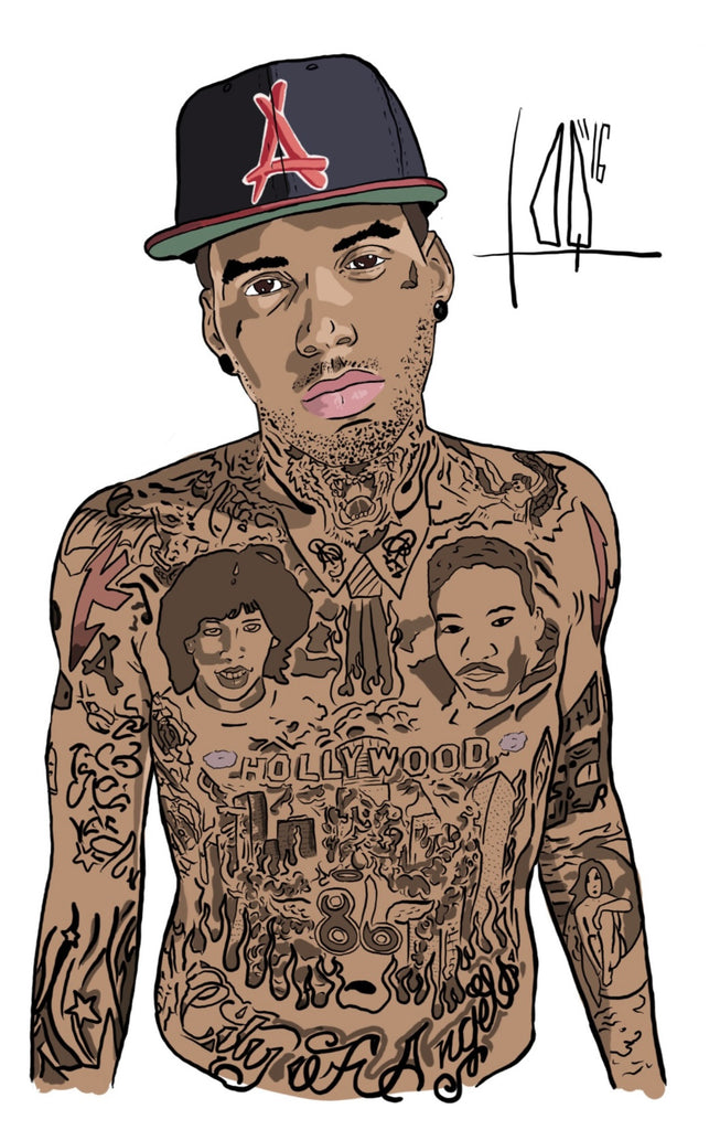 A bold and detailed portrait of Kid Ink, showcasing his heavily tattooed chest and face, paired with a flat-brim hat. A piece that represents music, controversy, and raw presence.
