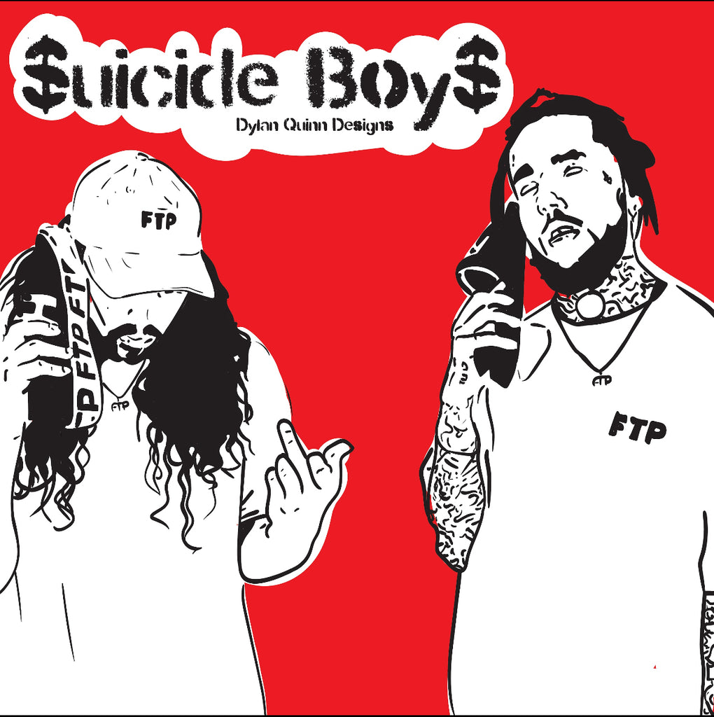 A bold, black-and-white digital illustration of the iconic rap duo, Suicideboy$, against a vibrant red backdrop. Their intense expressions and FTP branding amplify the raw energy of their music. Perfect for fans of underground rap and gritty street art styles.